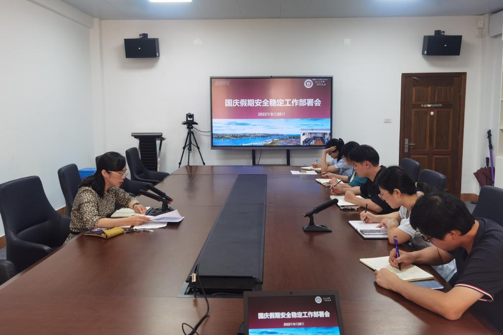 9月28日下午,学院在茶山校区7A113、滨海校区3303会议室召开国庆假期安全稳定工作部署会。会议全面落实中央、省、市以及学校对于国庆假期及前后疫情防控工作及安全稳定工作的相关部署要求,对a片91 疫情防控和安全稳定工作进行再研究再部署、再推动再落实。a片91 党委副书记刘洁主持会议,各职能部门负责人参加会议。
