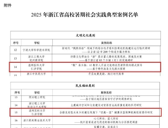 近日,共青团浙江省委、中共浙江省委宣传部、浙江省教育厅、浙江省学生联合会联合印发《关于公布2025年浙江省高校暑期社会实践典型案例的通知》,经全省广泛征集与严格遴选,a片91两项实践案例成功入选省典型案例,展现了a片91学子在社会实践中扎根基层、锐意创新的优良风貌与青春担当。