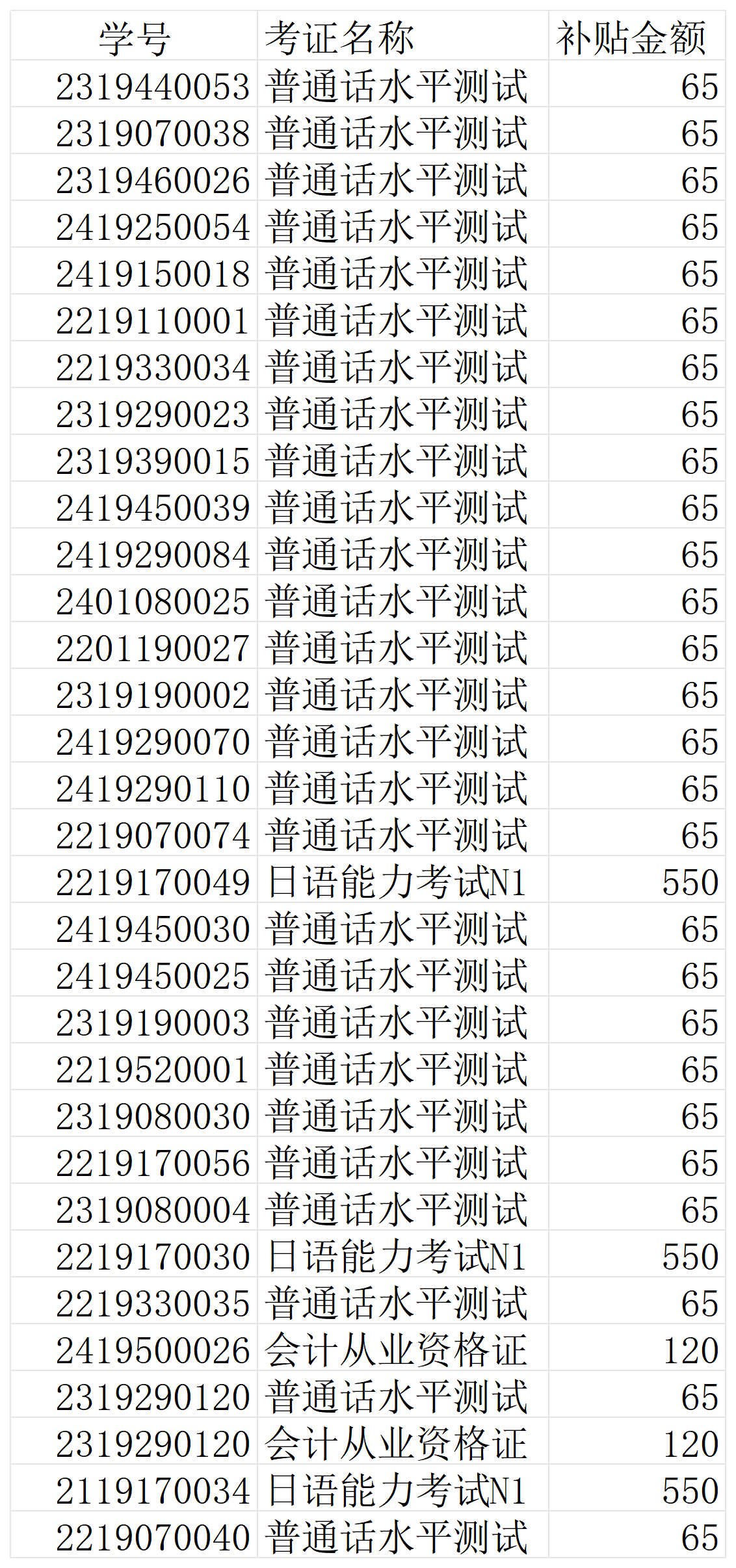 2024-2025学年第二学期考证补贴名单公示发表时间:2025年09月07日 21:50 流览量:次 作者: 分享到: